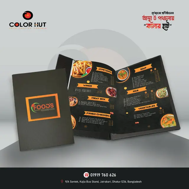 Color Hut also combines menu design and printing services in Bangladesh, ensuring consistent quality from design to final print. They use high-resolution graphics and professional formatting to create menus that are visually appealing and easy to read. This improves customer experience and increases the chances of repeat visits.